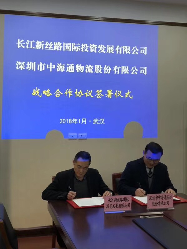 2018年1月22日,深圳市中海通物流股份有限公司董事长花亮一行到武汉考察,公司董事长董政接待了花董事长一行,双方就长江新丝路公司与深圳中海通共建东三省—武汉—云贵川多式联运粮食大通道达成合作意向,签署战略合作协议。