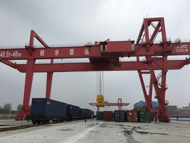 图为集装箱通过龙门吊吊装至货车专列