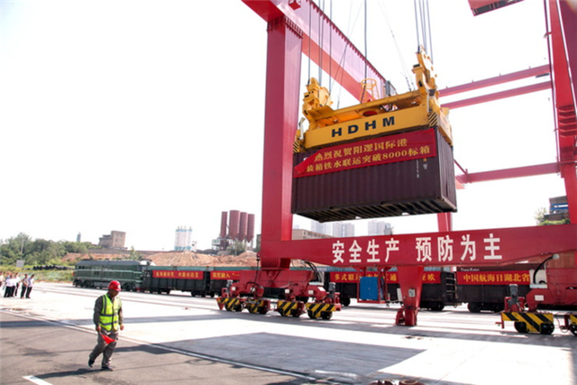 7月11日,随着阳逻铁水联运一期第8000TEU起吊发运,第14个“中国航海日”暨“世界海事日”,以“航海新时代,丝路再出发”为主题的“中国航海日湖北主题活动暨铁水联运成功突破8000TEU”在阳逻国际港铁水联运国家示范工程举行。