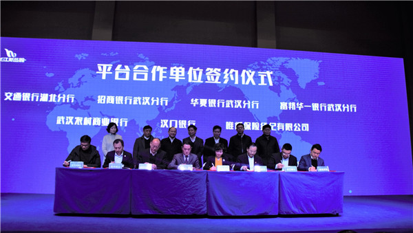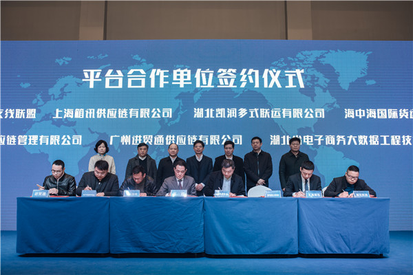 武汉港航发展集团有限公司总经理涂山峰、湖北省运管物流局局长陶维号、湖北省港航管理局局长王阳红、江汉区人民政府区长李湛、武汉港航发展集团有限公司副总经理兼长江新丝路国际投资发展有限公司董事长董政、武汉港航发展集团有限公司副总经理施载玲、武汉港航发展集团有限公司总会计师朱超安、湖北省贸易促进会二级巡视员王勇等领导共同见证了长江新丝路公司与14家合作单位签署合作协议,协议双方拟在共同推进平台多式联运、贸易服务、金融服务等物贸服务领域,以互利互惠为基础,开展各方面的合作。