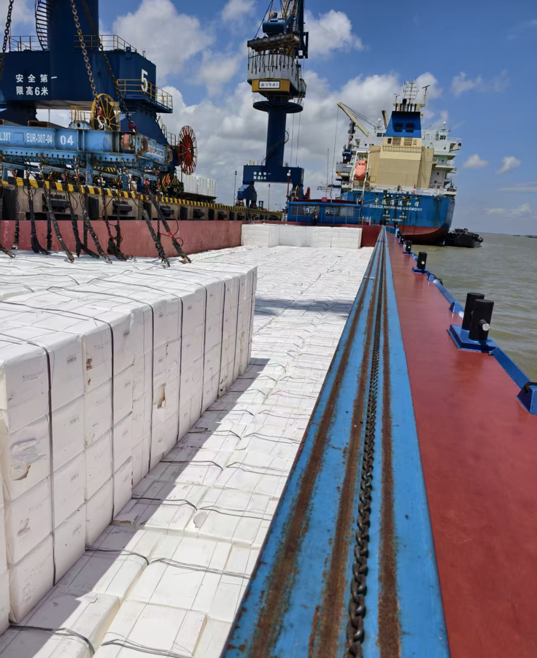 据悉,第一批8000吨纸浆于7月9日从常熟码头装船起运,预计7月14日抵达黄冈唐家渡码头完成装箱后,将通过铁路发往西南、西北等区域。