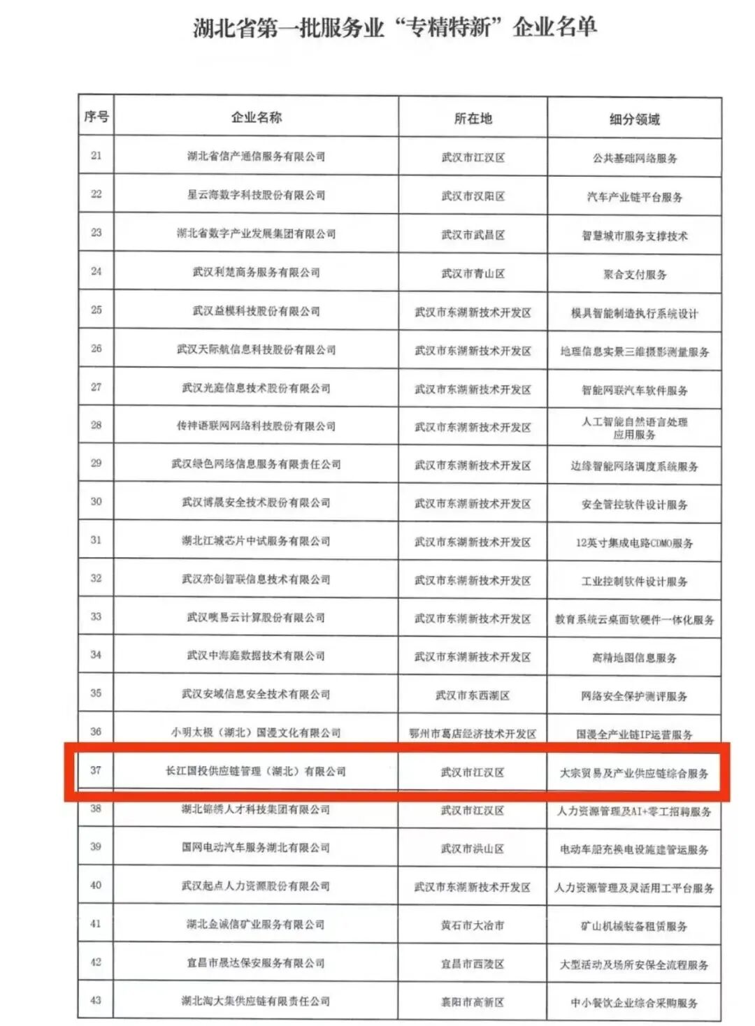 日前,省发改委公布湖北省第一批服务业“专精特新”企业名单,长江国投供应链管理(湖北)有限公司(简称长江国投公司)成功入选。