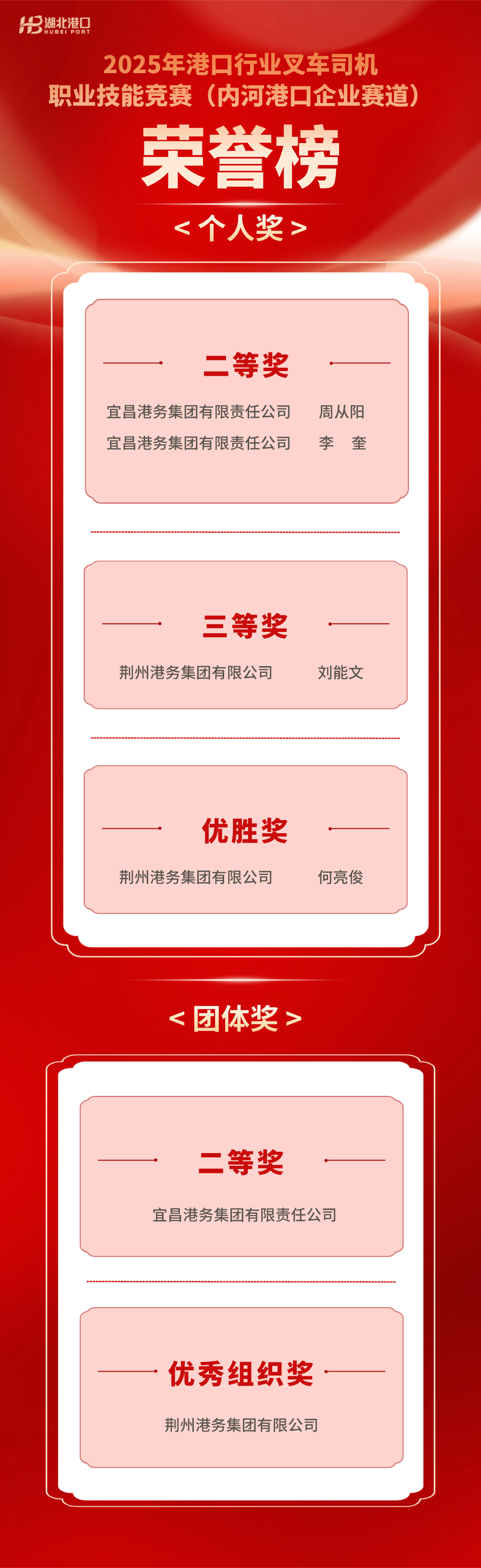 11月5日—6日,2025年港口行业叉车司机职业技能竞赛(内河港口企业赛道)在江苏张家港成功举办。宜昌港务集团有限责任公司(简称宜港集团)、荆州港务集团有限公司(简称荆港集团)分别组队参赛,共斩获个人、团体6项荣誉,其中:个人二等奖2项、三等奖1项、优胜奖1项,团体二等奖1项,优秀组织奖1项。